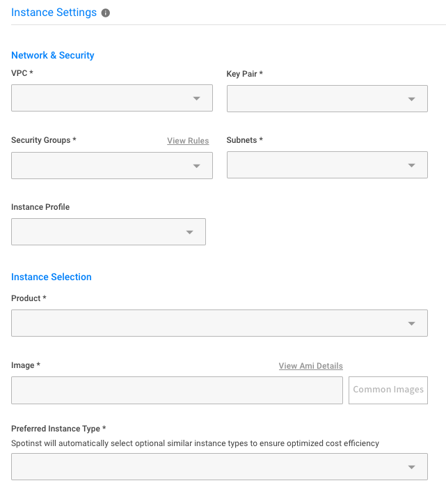 Once VPC, Subnets, Product, Image and Preferred Node type are selected, Spot will automatically preselect optional similar Spot Markets to ensure optimized cost efficiency. The Spot Market Scoring Table on the right side will be populated: