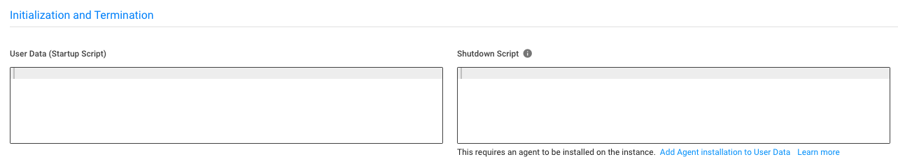 9. Shutdown Script requires an Agent to be installed via the User Data. Clicking on the Add Agent installation to User Data link will automatically add the required bash script to the User Data section.