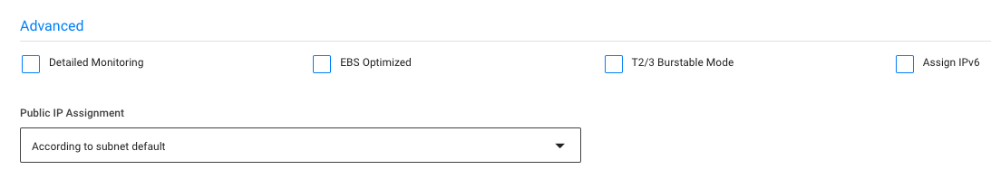 11. Enter any additional settings such as detailed monitoring for Amazon CloudWatch, EBS optimization, Burstable CPU for T2 or 3 nodes, IPv6 assignment and Public IP assignment.