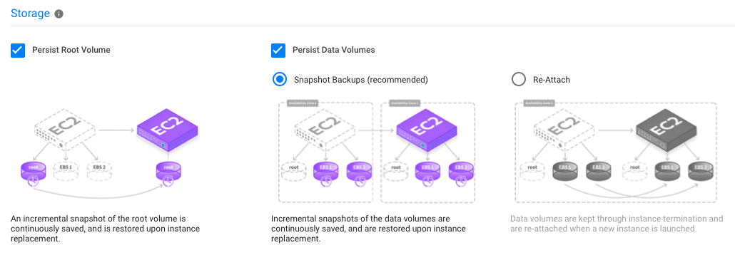 • Re-Attach: Data volumes are kept through node termination and are re-attached when a new node is launched.